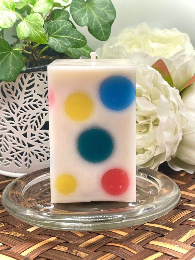 Dots soy pillar candle.